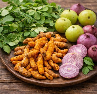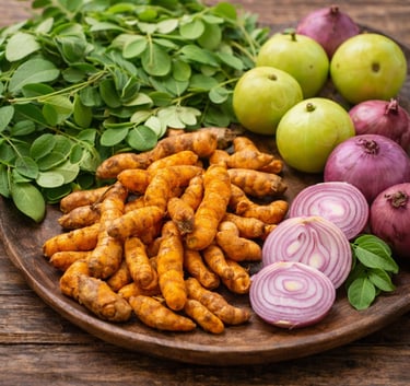 High-quality raw materials like moringa leaves, turmeric roots, amla, and onions.