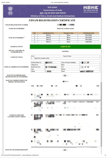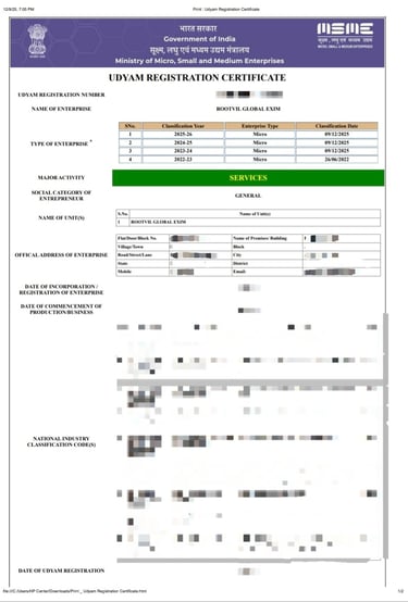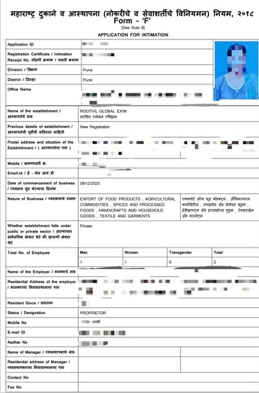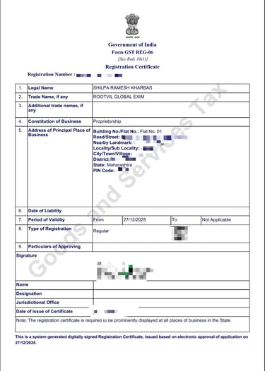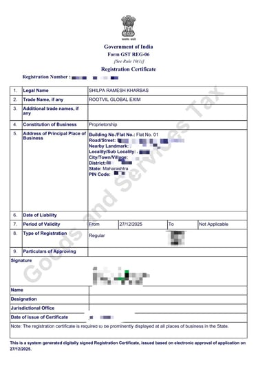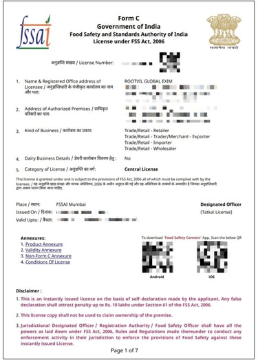 ROOTVIL GLOBAL EXIM operates as a fully registered and compliant food export business under Government of India regulations.